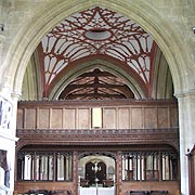 Edington is where King Alfred defeated the Vikings in AD 878. The church there has always belonged to Romsey Abbey in Hampshire and it was transformed into a priory in 1358 by William Edington, the Bishop of Winchester, who was born in the village. It was a house of Augustinian Canons (not Bonhommes as sometimes stated) and the present building almost entirely dates from this time: an excellent example of the transition from Decorated to Perpendicular style. Remains of the monastic buildings are incorporated into what is left of the manor house to the north. It was from Edington Priory that the Bishop of Salisbury was dragged and murdered during Jack Cade's rebellion of 1450! The last prior became Bishop of Bristol. His priory church survived because it was also used by the parish. It features a two-storey porch and contains a fine screen of 1500, Atlas-like niche supporters, a few pieces of 14th century glass, medieval marble floors, beautiful Victorian mosaic work and a spiked Jacobean altar-rail to keep the dogs out! There are excellent monuments to knights of the Rous family, an unknown monk with puzzling rebus, Sir Ralph Cheney (1401) with his missing brass and Sir Simon Richard Brissett Taylor sculpted on his deathbed by Sir Francis Chantrey (1815). the star of the show, however, is Lady Beauchamp's monument featuring husband and kneeling children beneath a curtained canopy (1630) from which an extraordinary descending cherub (1664) offers them a crown of glory! The place is also associated with the poetic saint, George Herbert, who was married there in 1629 and the actress/prostitute-cum-Duchess of Bolton, Lavinia Beswick, who is believed to be buried there. The pictures on this page are cropped examples of images in our high resolution photo library. Please e-mail us for details of these or similar image availability at our very reasonable reproduction rates. |